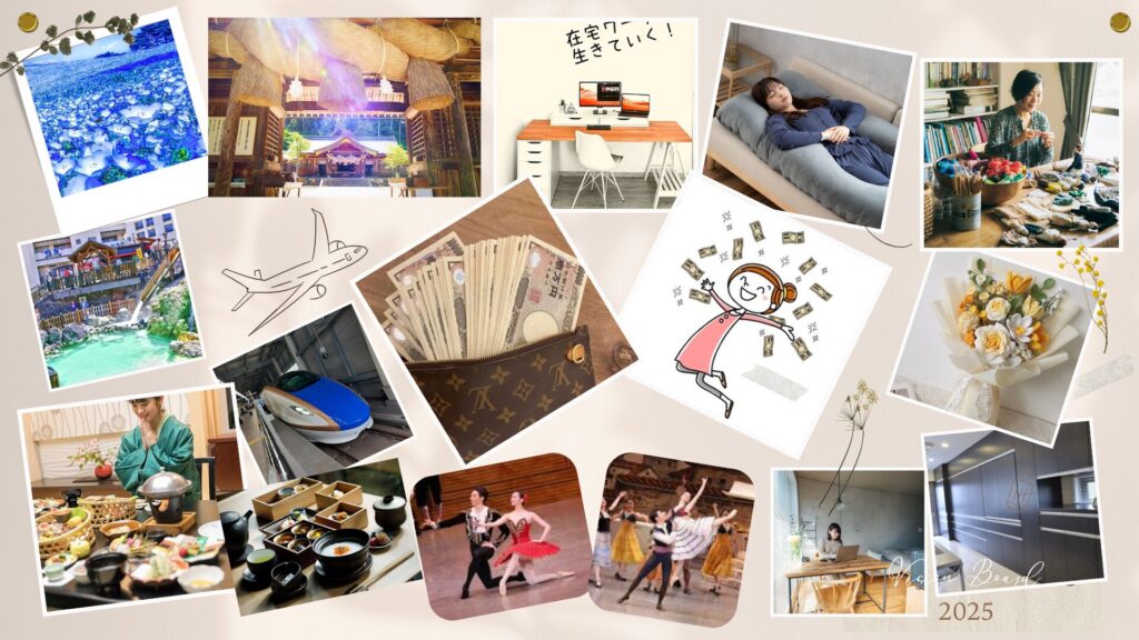 行きたい旅行先の写真やこうなりたい!っていう写真を集めてコルクボードとかにどんどん貼っていくだけ。