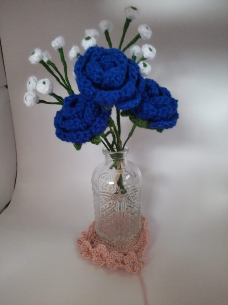 一緒に、きれいなブルーの毛糸が買えたので、青いバラも編んでみました。