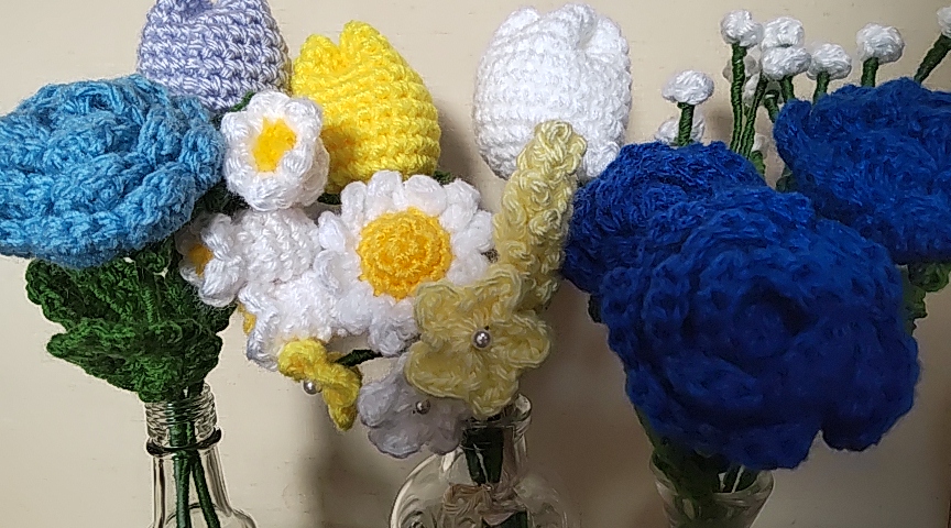 でも、だんだん毛糸で編んだお花が増えてきて机の上を見ると癒されます💐🌹🌷😊